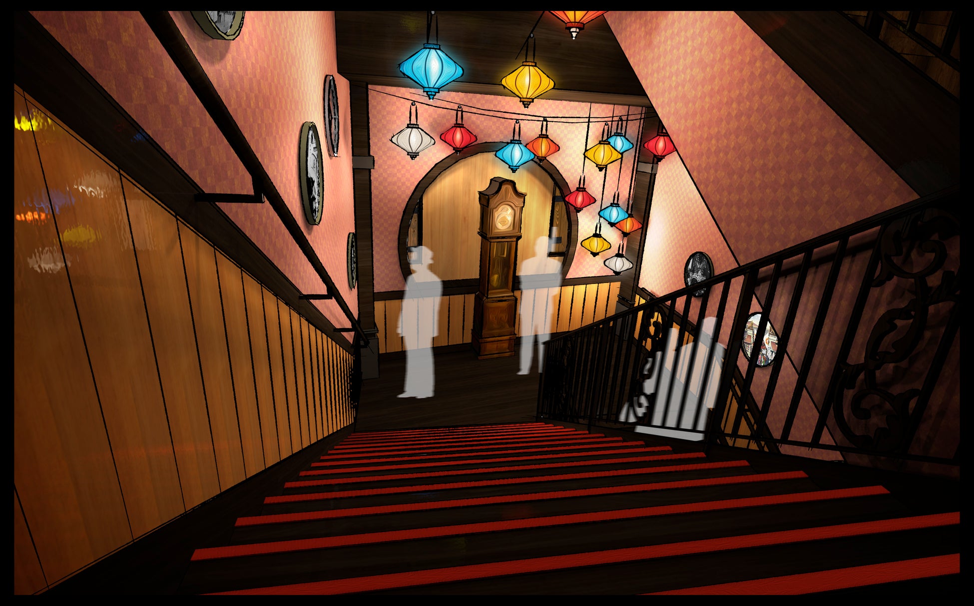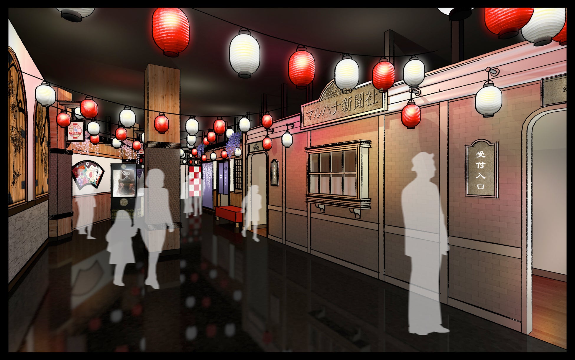 来園者を現代から過去へと誘うレトロな雰囲気の階段。花やしきの過去の風景写真も展示します。新エリアに繋がるこの階段は、1階の入口部分からも2階の気配を感じ取れるよう、天井部分には2階へと繋がる提灯が存在。時を遡る雰囲気をお楽しみいただけます。
